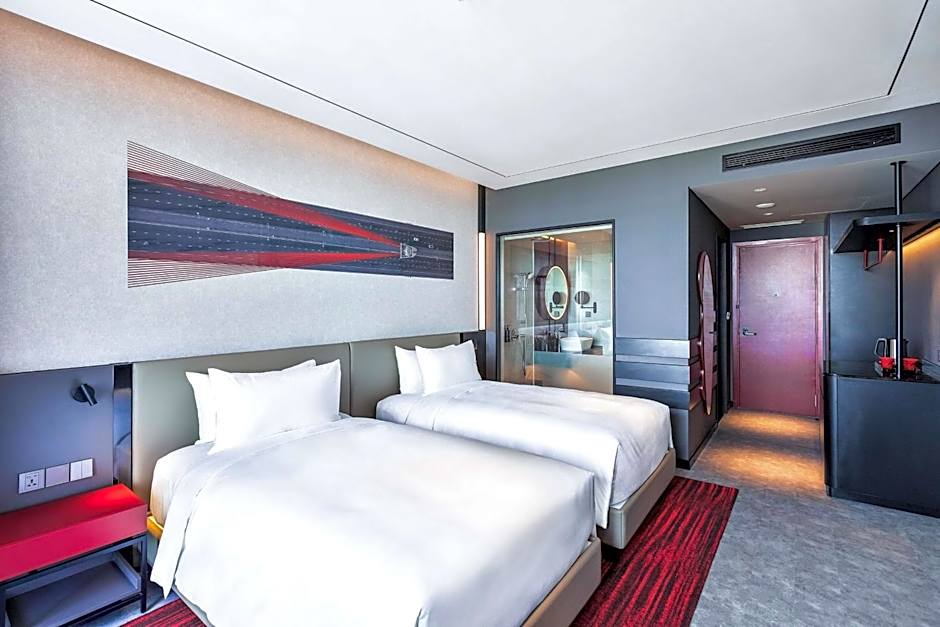 The spacious twin/double room features air conditioning, a mini-bar, a balcony with city views as well as a private bathroom boasting a shower.